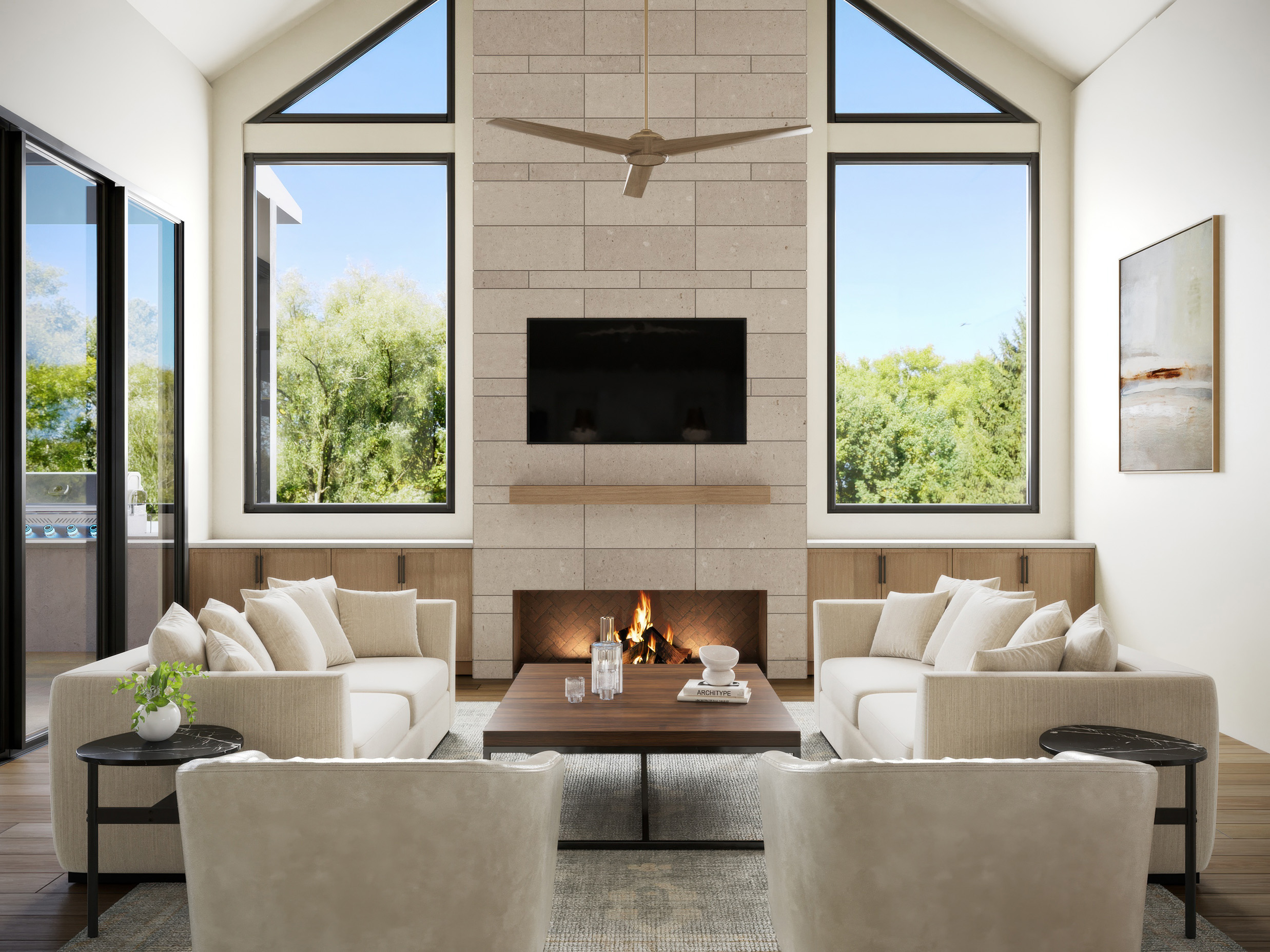 A striking gallery-style entry welcomes you with floor-to-ceiling windows and a custom Trustile by Marvin double wood grand entrance doors, sets the tone for the elegant interiors beyond. Soaring vaulted ceilings with beams, expansive glass, and a true masonry fireplace create a living space both dramatic and inviting. Designed for gatherings, the floorplan includes a formal dining room, a chef’s kitchen anchored by a full Sub-Zero and Wolf suite, and seamless transitions to over 600 square feet of covered outdoor living. Here, an outdoor kitchen with BBQ grill complements an approx. 32-foot swimming pool with spa, beach entry, and pebble finish—perfectly balancing sophistication with everyday enjoyment.